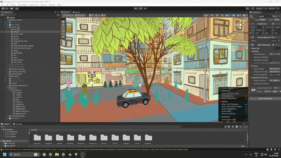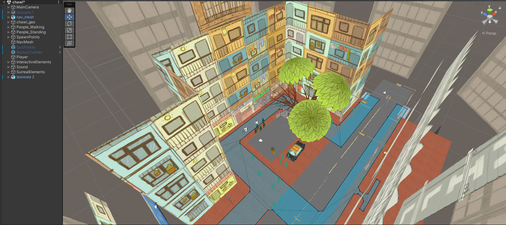 The camera icon is where we start the experience, right outside CST station, where the cab-wala picks us up. As you can see with the sound icons, they have been placed spatially to create depth and layering in storytelling and VR experience. The blue path is where the flat cutout crowd walks randomly based on Alaps code wizardry.