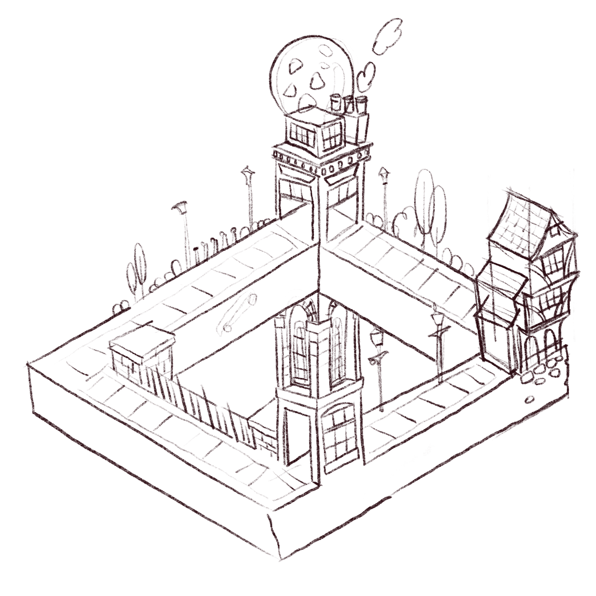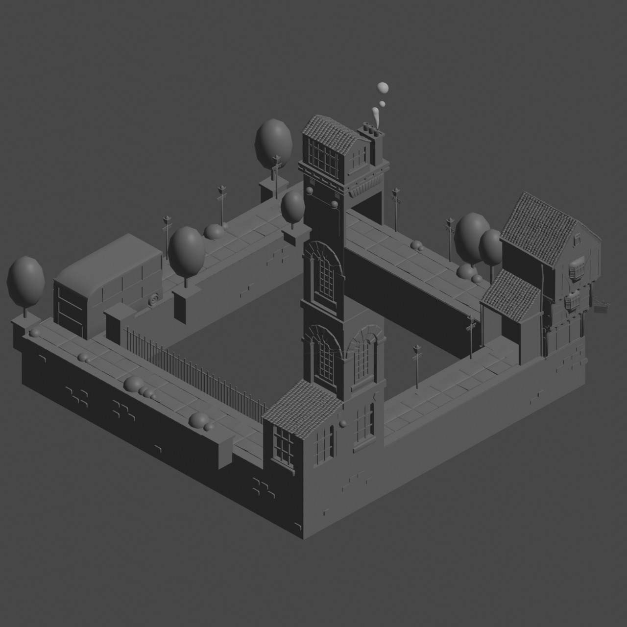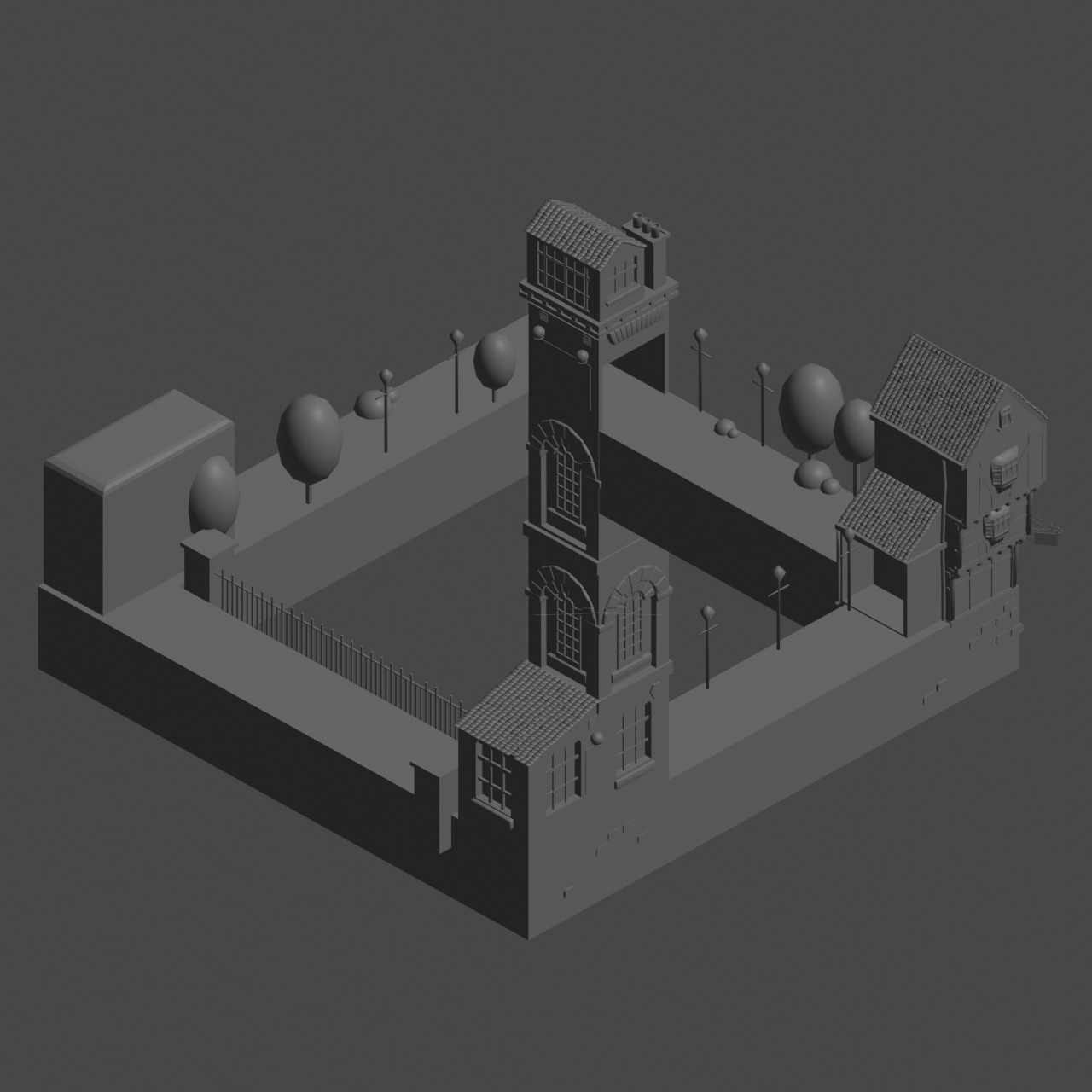 Modelled the central tower and rest of the background elements