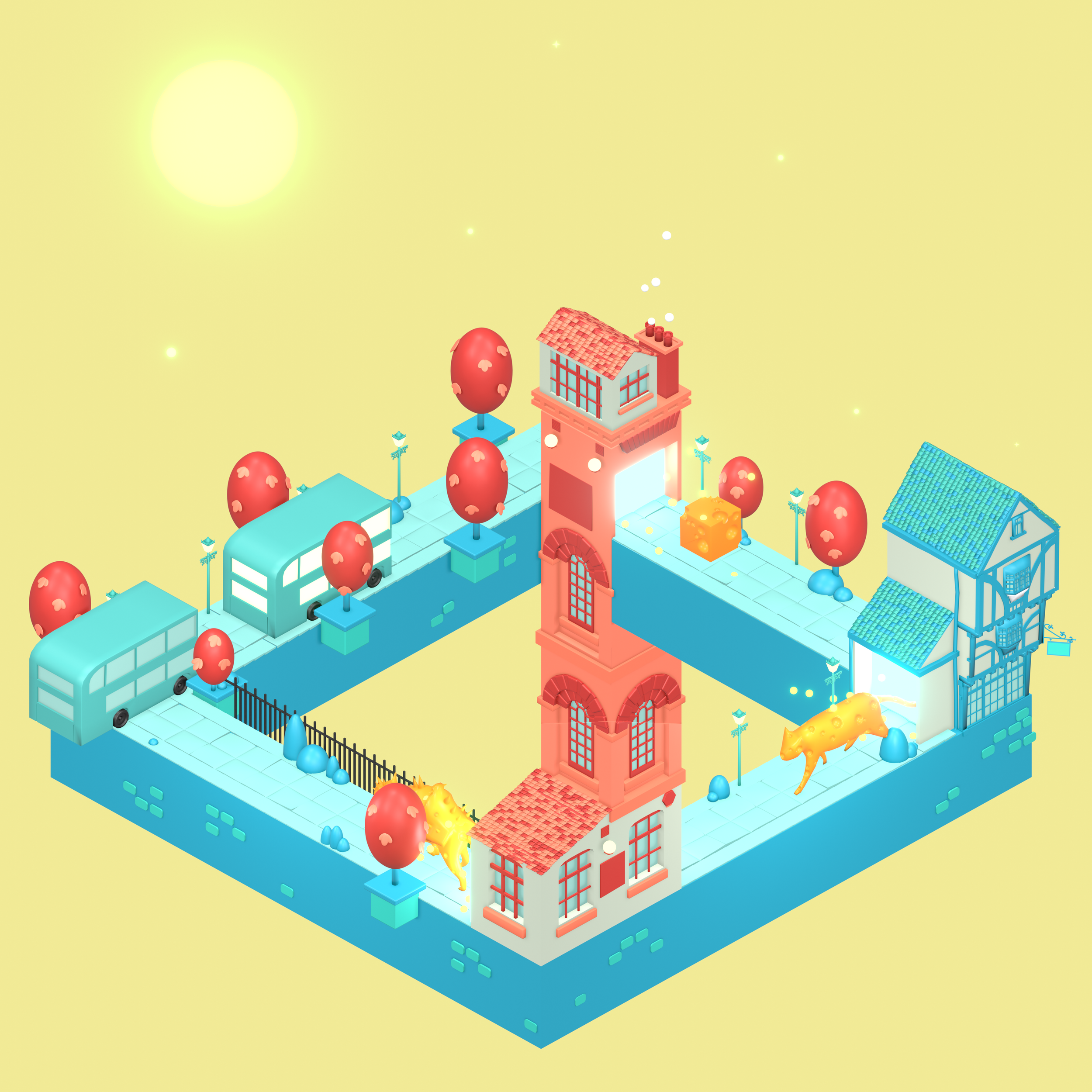 Added glow and animation to stars, buses and other objects to finish the loop.