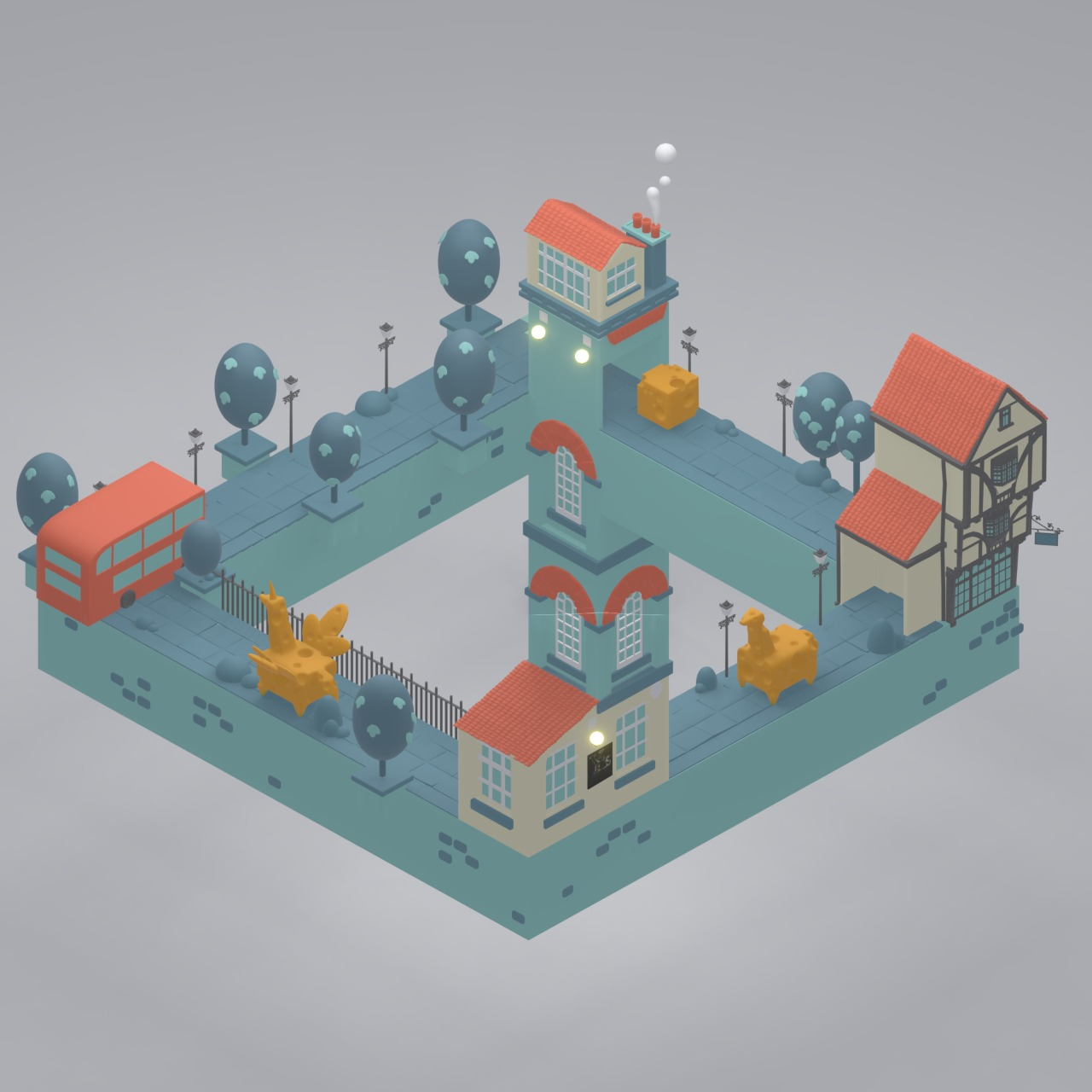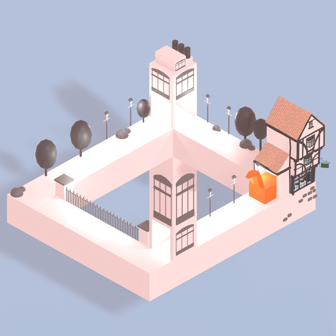 Playing around with Penrose triangle / impossible triangle / visually like monument valley game. The sides of the triangle are conveyer belts and each corner has a tower.