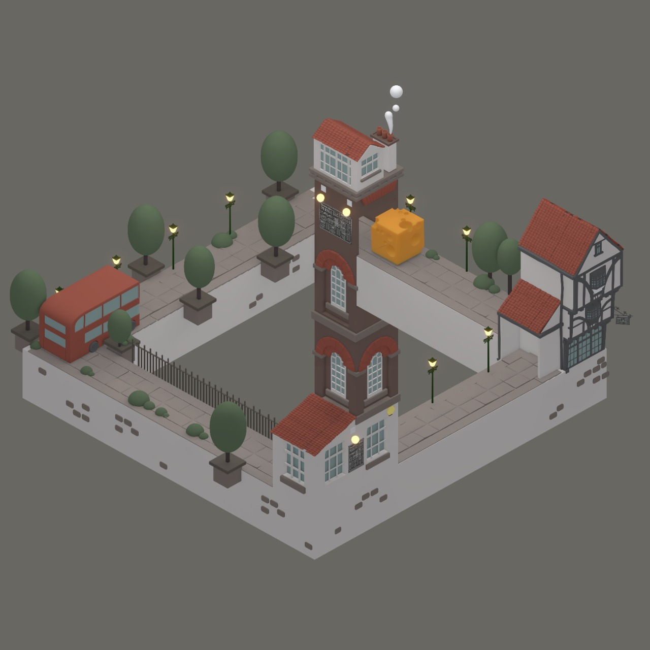 The place holder for smoke coming out of the chimney, and the amber coming out of the shops was replaced by particle emitters.